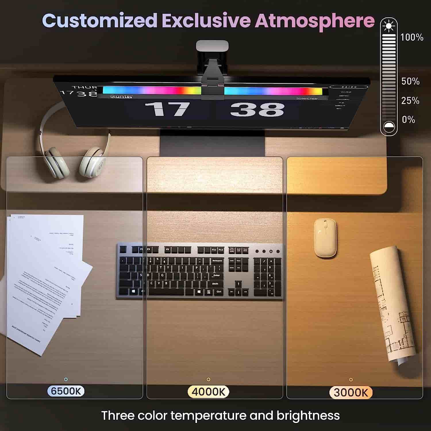 - 【Flexible Weighted Clip Easy to Install & Space Saving】Rotatable gaming light bar for optimal light coverage.Scientifically designed weighted clip with non-slip rubber for worry-free attachment.Mounts easily on top of most monitors with specified thickness range.Space-saving design on the desk.