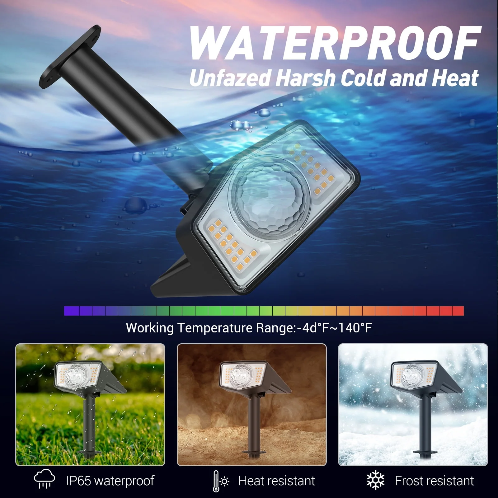 - [IP65 Waterproof & All Weather Resistant]-Garden olar spot lights constructed with durable high strength ABS material and IP65 waterproof rating, our solar spotlights are designed to withstand all kinds of extreme weather conditions waterproof, frost proof, heat resistant and durable from -4°F to 140°F.