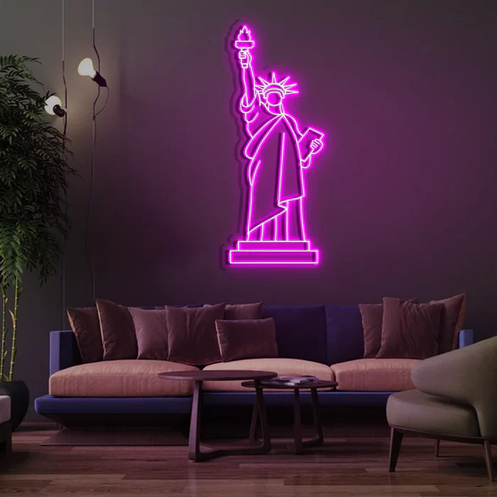 Symbol of Freedom and Inspiration: Featuring the Statue of Liberty in a radiant purple hue, this neon sign symbolizes freedom and inspiration. Its iconic design adds a layer of historical significance while embodying a modern aesthetic. The sign serves as a powerful visual reminder of the ideals of liberty and democracy, making it a meaningful addition to any space.